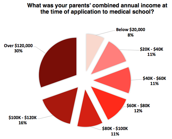 Figure 2. Admissions Favors the Wealthy. While the median household income in the United States is $60K/year, 69% of medical school students and residents reported household income of over $60k/year at the time of application.