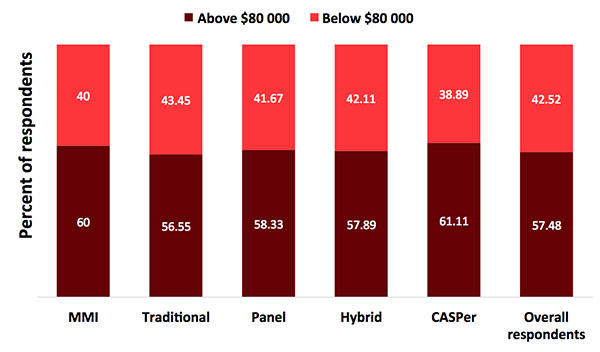 Two independent studies by SortSmart in the United States and Canada demonstrated that wealth does not correlate with the probability to use admissions preparation services. This makes perfect sense. The cost of our services are a fraction of what it costs to obtain a professional degree or attend an in-person multiple mini interview (in-person format of CASPer) for example, which requires applicants to travel thousands of miles and pay thousands of dollars for flight and accommodation, never mind the hefty application costs. Furthermore, professional school students on average have to pay up to $50,000 dollars per year just for tuition or risk going into debt and later forced to pay all back with interest. Therefore, it’s easy to see how naïve and false such a conjecture appears, even without the facts that show admissions prep does not correlate with wealth.